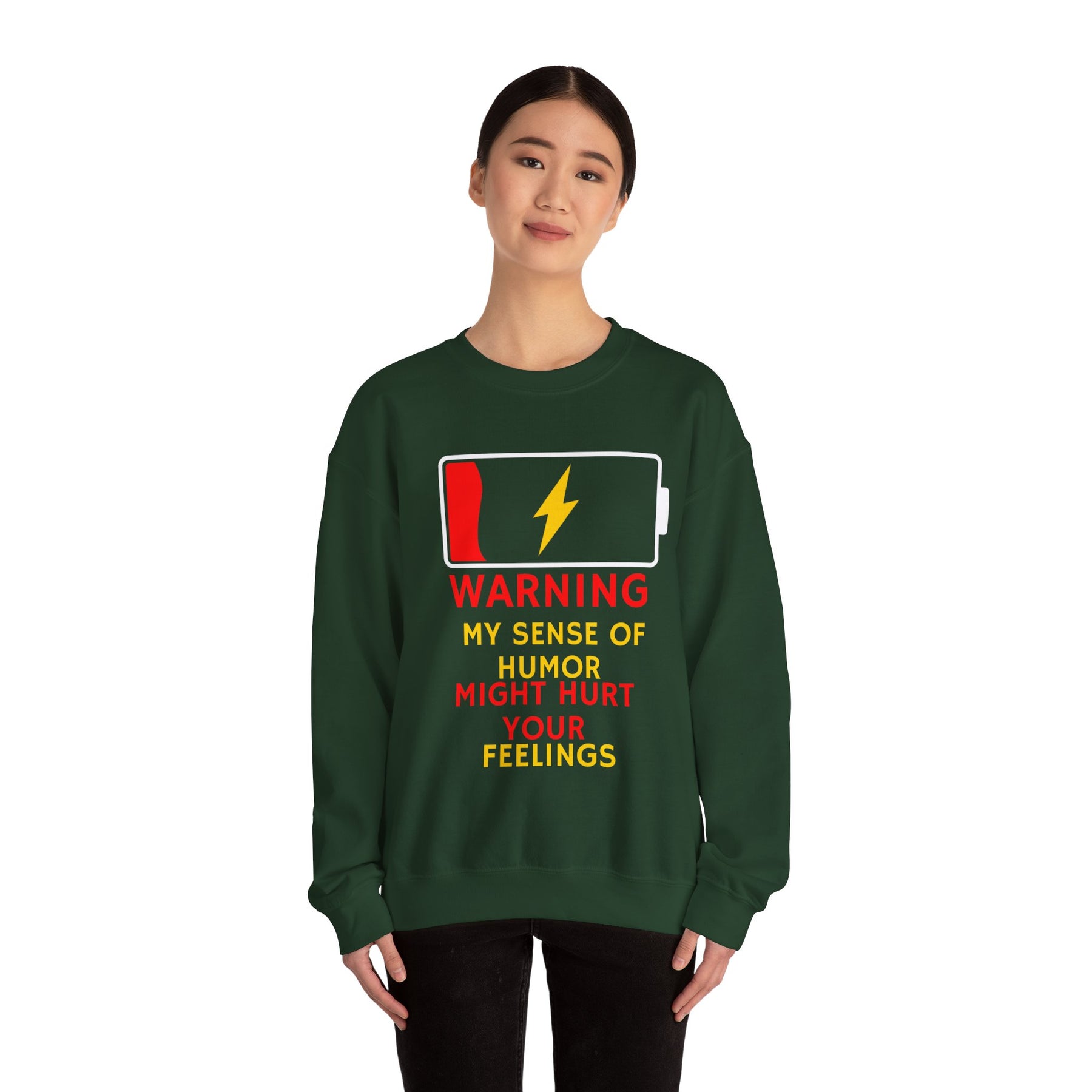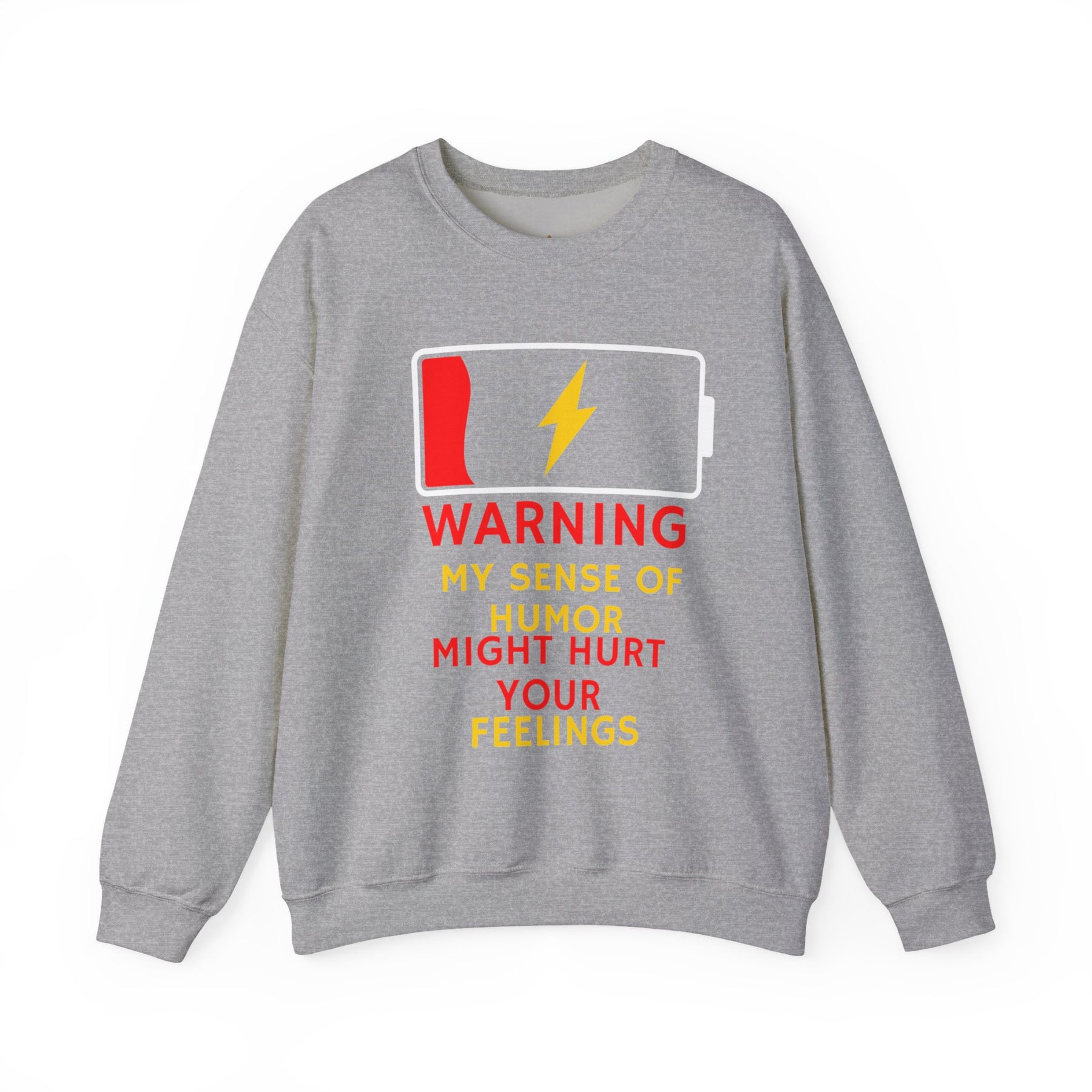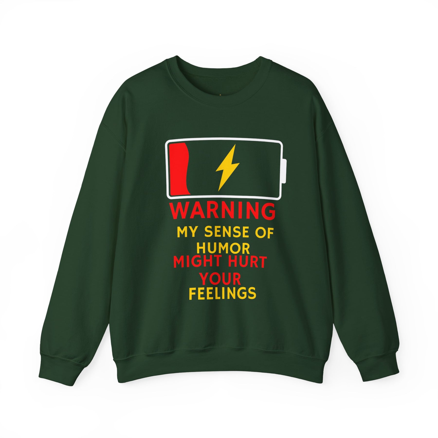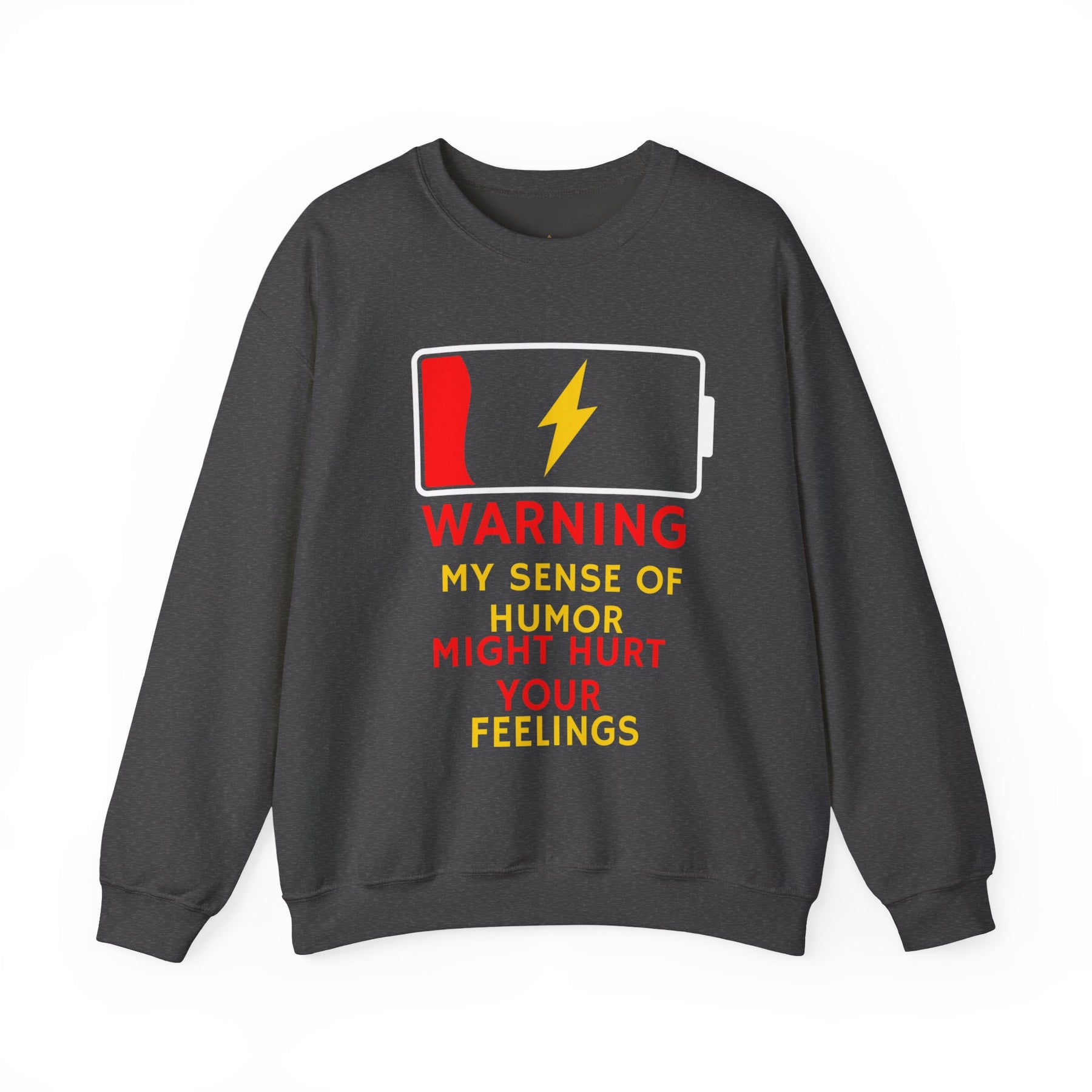 Crewneck Sweatshirt — "Warning: My Sense of Humor Might Hurt Your Feelings" Low Battery Graphic