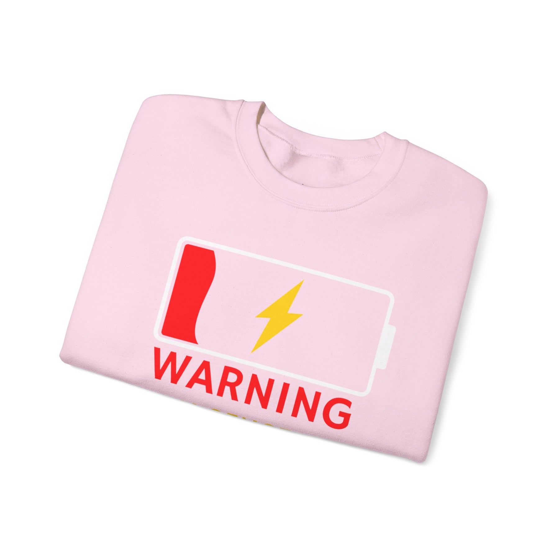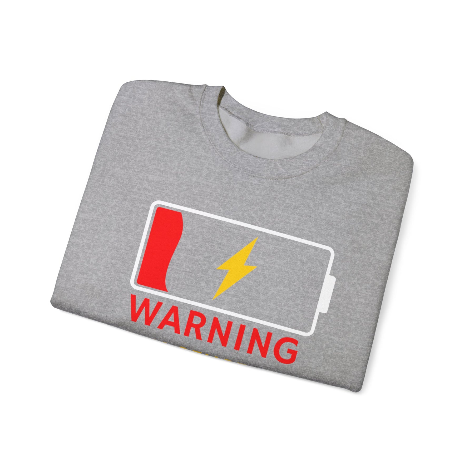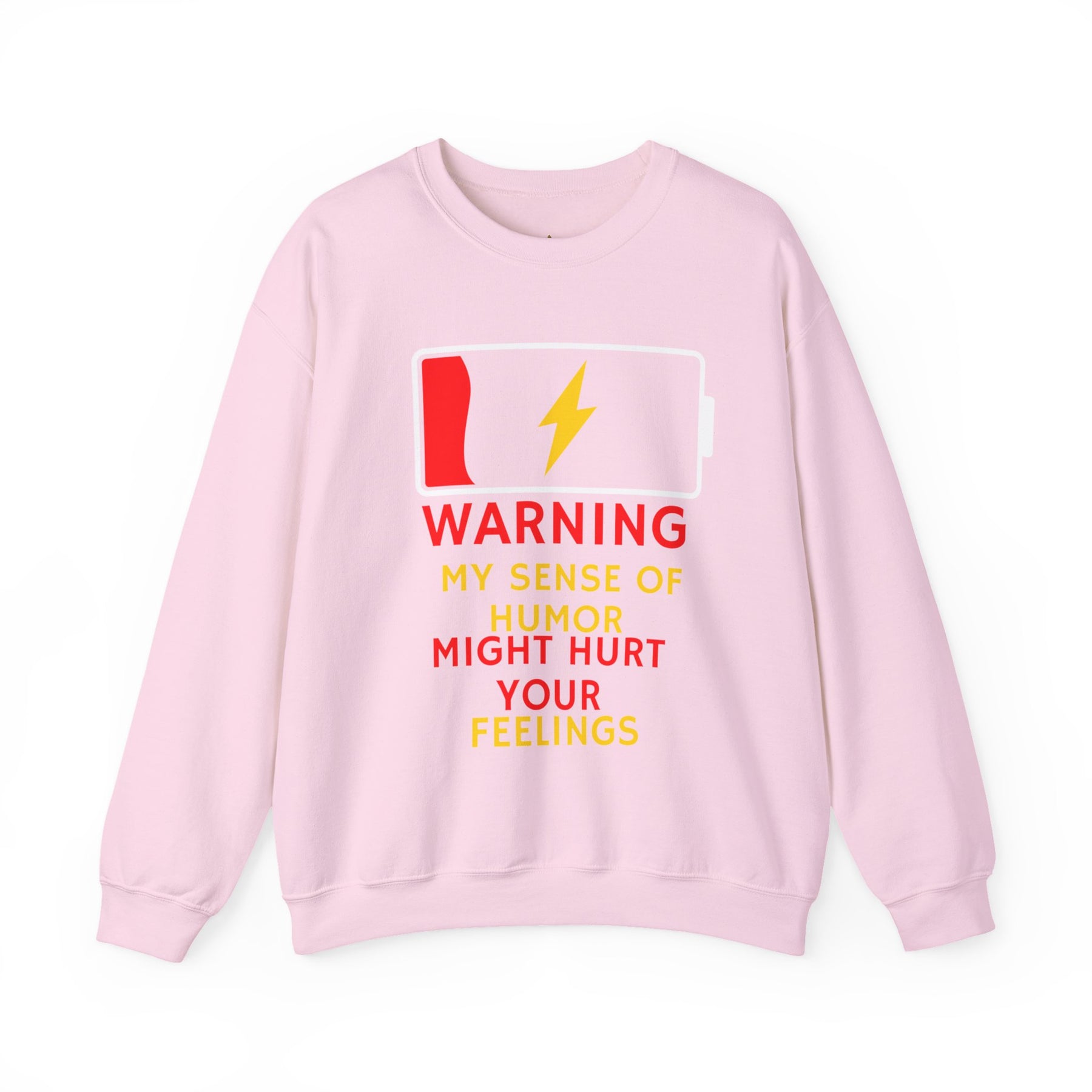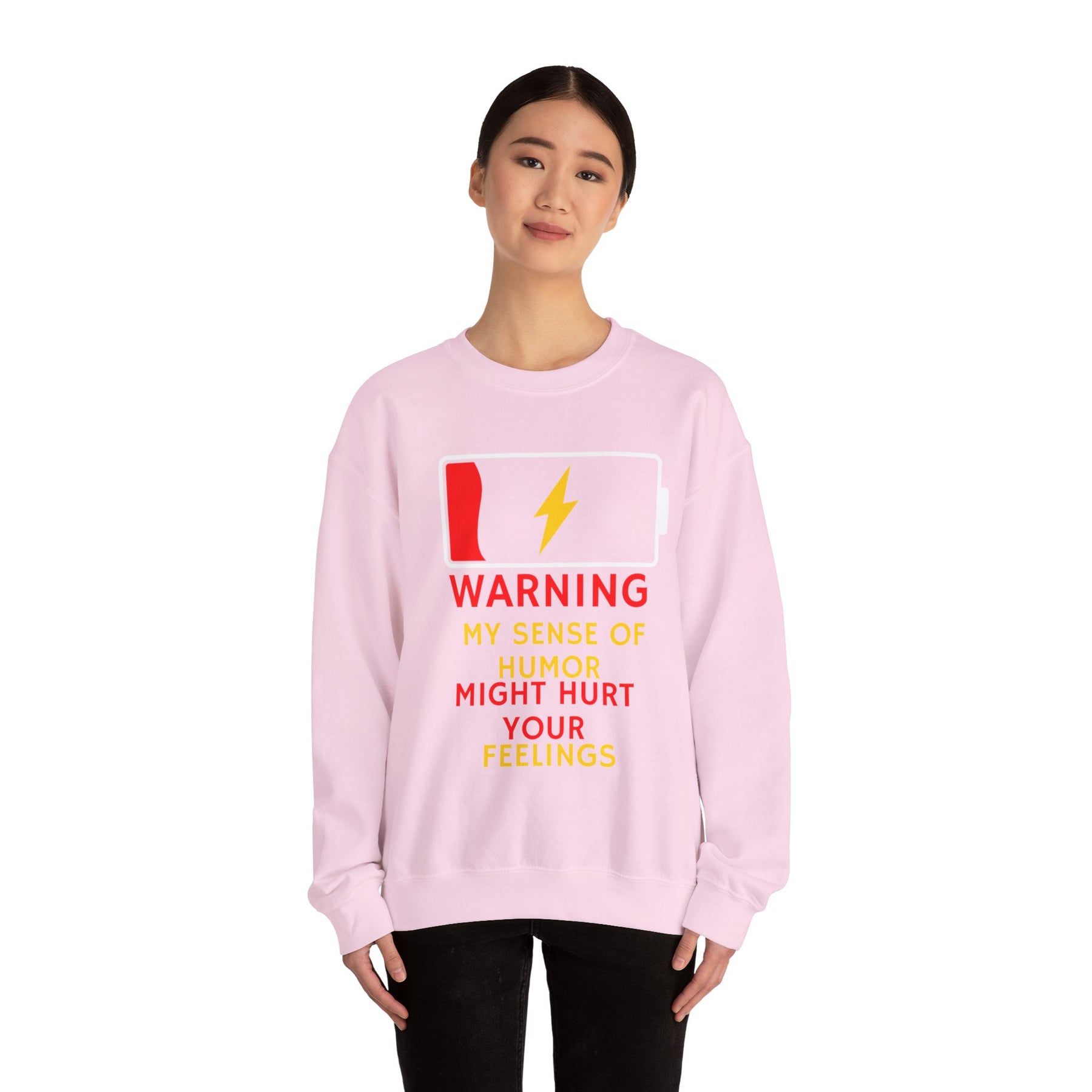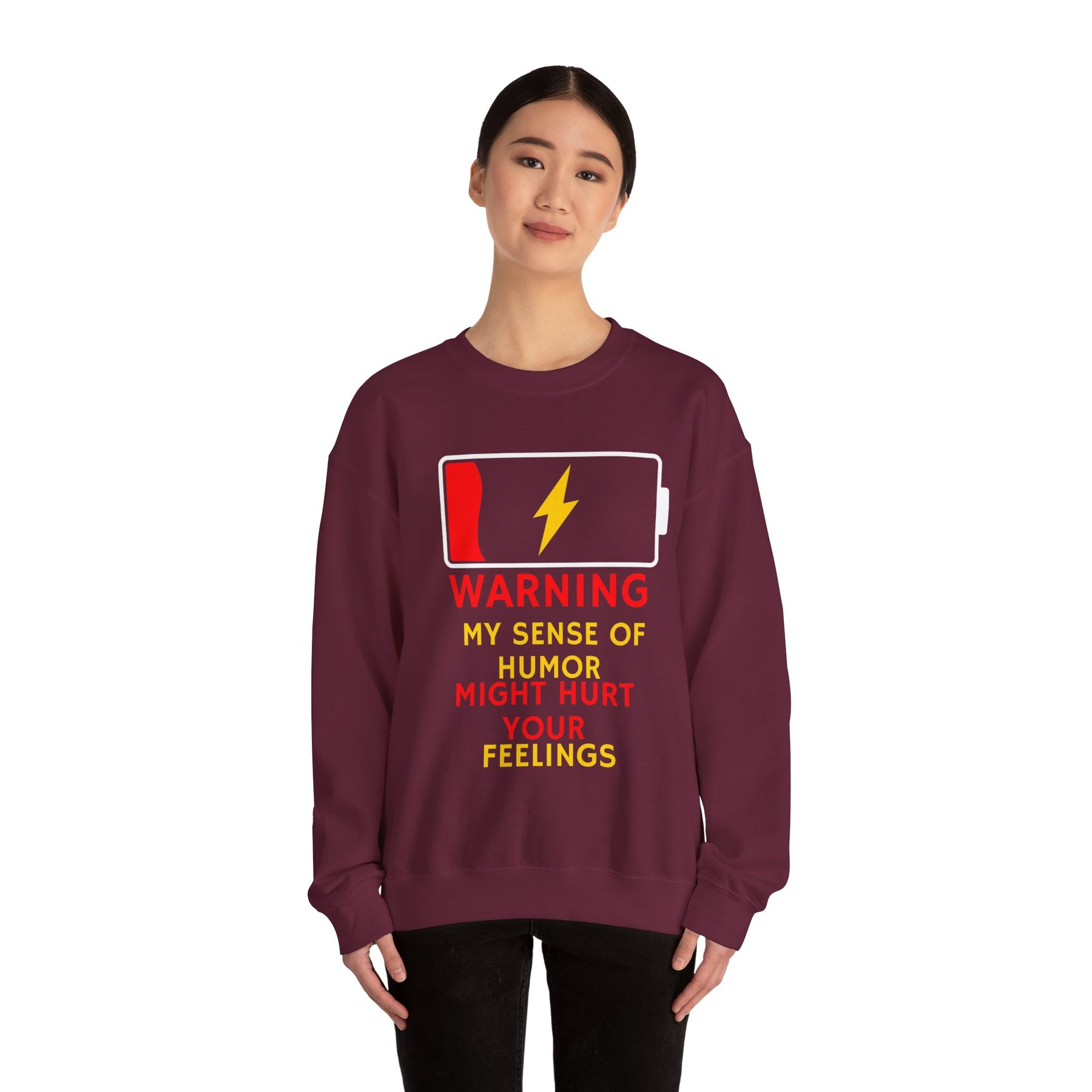 Crewneck Sweatshirt — "Warning: My Sense of Humor Might Hurt Your Feelings" Low Battery Graphic
